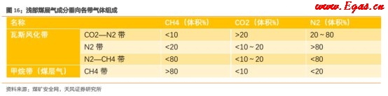 在接近地表的煤層內(nèi),原生的天然氣向上運(yùn)移,離開(kāi)煤層,地面空氣和地表的生物化學(xué)和化學(xué)反應(yīng)所產(chǎn)生的氣體向下滲透,進(jìn)入煤層,從而淺部煤層氣成分形成垂向分帶現(xiàn)象。一般自上而下可分為四個(gè)帶:二氧化碳—氮?dú)鈳?,氮?dú)鈳?,氮?dú)?mdash;甲烷帶,甲烷帶。采煤界將前三個(gè)帶統(tǒng)稱(chēng)為"瓦斯風(fēng)化帶",在"瓦斯風(fēng)化帶"下的"甲烷帶"才是煤層氣的主要開(kāi)采區(qū)域。具體如下表所示: