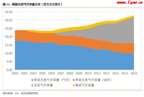 2002年之前,美國非常規(guī)天然氣的產(chǎn)量非常小,幾乎可以忽略。2002年之后,美國常規(guī)天然氣的產(chǎn)量出現(xiàn)了明顯下滑的趨勢。在煤層氣鉆井技術(shù)提高和政府財政補貼支持的雙重作用下,美國煤層氣產(chǎn)業(yè)在2002年之后進入了快速發(fā)展期,彌補了常規(guī)天然氣產(chǎn)量下滑的缺口。隨著頁巖氣革命的爆發(fā),2009年美國以6240億立方米的產(chǎn)量首次超過俄羅斯成為世界第一天然氣生產(chǎn)國,頁巖氣的產(chǎn)量快速爆發(fā),產(chǎn)量幾乎與常規(guī)天然氣相當。而煤層氣的產(chǎn)量則逐步穩(wěn)定下來且略有下降。