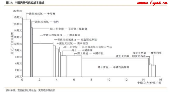 從供給端各類型天然氣的成本來看,煤層氣的成本介于陸上常規(guī)天然氣和管道進口天然氣之間,遠小于同為非常規(guī)國產(chǎn)天然氣的頁巖氣。由于液化天然氣(LNG)運輸較靈活,所以隨著國際油價和天然氣價格的波動,進口液化氣(LNG)也相對波動比較大。
