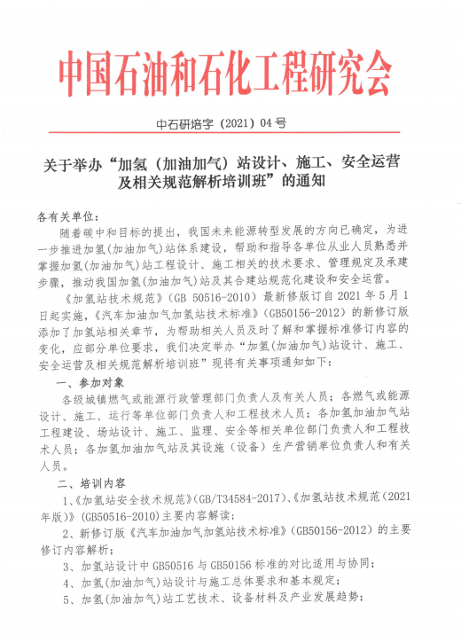 關于舉辦“加氫(加油加氣)站設計、施工、安全運營及相關規(guī)范解析培訓班 ”的通知