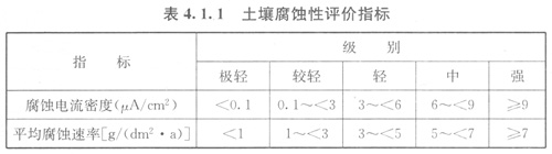 4.1.1土壤腐蝕性應(yīng)采用檢測(cè)管道鋼在土壤中的腐蝕電流密度和平均腐蝕速率判定。土壤腐蝕性評(píng)價(jià)指標(biāo)應(yīng)符合表4.1.1的規(guī)定。