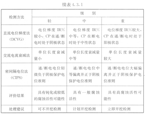 4.3.l管道防腐層缺陷的評(píng)價(jià)可采用交流電位梯度法、直流電位梯度法、交流電流衰減法和密間隔電位法進(jìn)行,防腐層缺陷評(píng)價(jià)分級(jí)應(yīng)符合表4.3.1的規(guī)定。