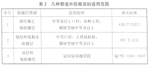 5.1.3幾種管道外防腐層的適用范圍可參考表2。