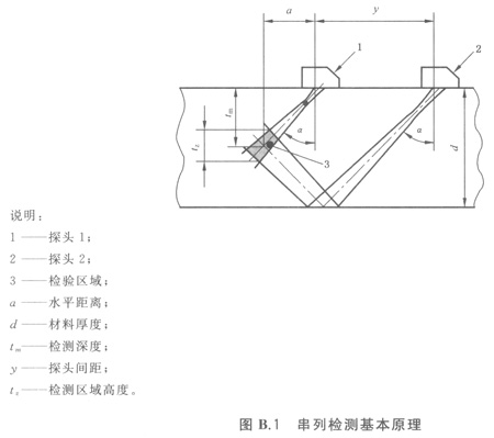 斜探頭間距(y)、聲束軸線交叉點檢測深度(tm)和檢測區(qū)域高度(tz)之間的關(guān)系見圖B.1。