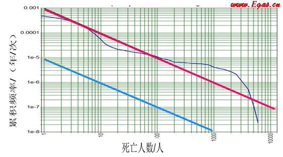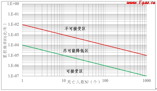 綜合考慮,我國(guó)采用香港地區(qū)的社會(huì)可接受風(fēng)險(xiǎn)標(biāo)準(zhǔn)值,作為個(gè)人可接受風(fēng)險(xiǎn)標(biāo)準(zhǔn)的補(bǔ)充對(duì)危險(xiǎn)源造成群死群傷事故風(fēng)險(xiǎn)的可接受程度進(jìn)行評(píng)估。