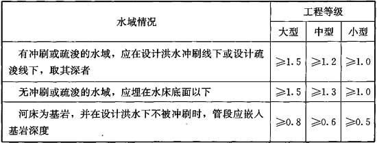 4.2.3 穿越水域的燃?xì)夤艿赖淖钚「餐梁穸龋瑧?yīng)根據(jù)工程等級(jí)與相應(yīng)設(shè)計(jì)洪水沖刷深度或疏浚深度要求確定,并符合下列規(guī)定: