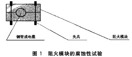 分別取長(zhǎng)為250mm、外徑為Φ30mm~Φ40mm的Q235普通碳素結(jié)構(gòu)鋼管兩根和長(zhǎng)為250mm、外徑為Φ30mm~Φ40mm的PVC絕緣護(hù)套電纜3根,在阻火模塊上鉆出與鋼管和電纜直徑相同的孔洞,并對(duì)剖。將鋼管和電纜置于阻火模塊的孔洞中,并用夾具固定,固定方式見(jiàn)圖1。七天后,觀察鋼管和電纜外層膠皮與堵料試樣接觸部位是否出現(xiàn)銹蝕、腐蝕現(xiàn)象。
