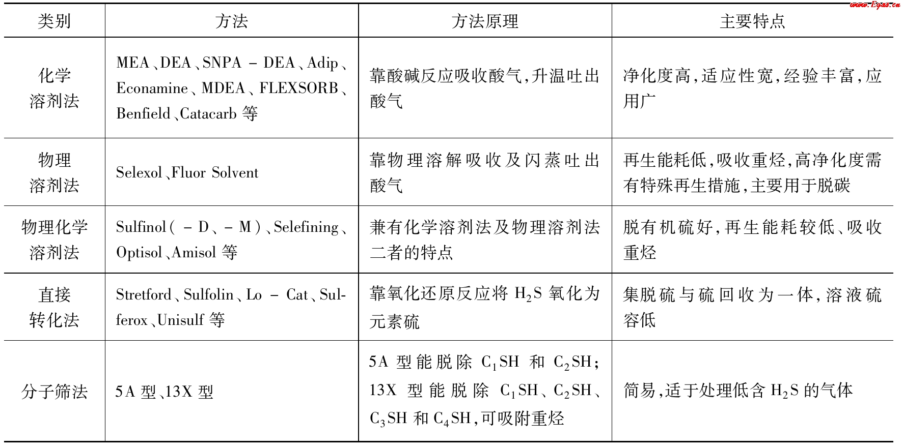 表2-2 天然氣中酸氣脫除方法