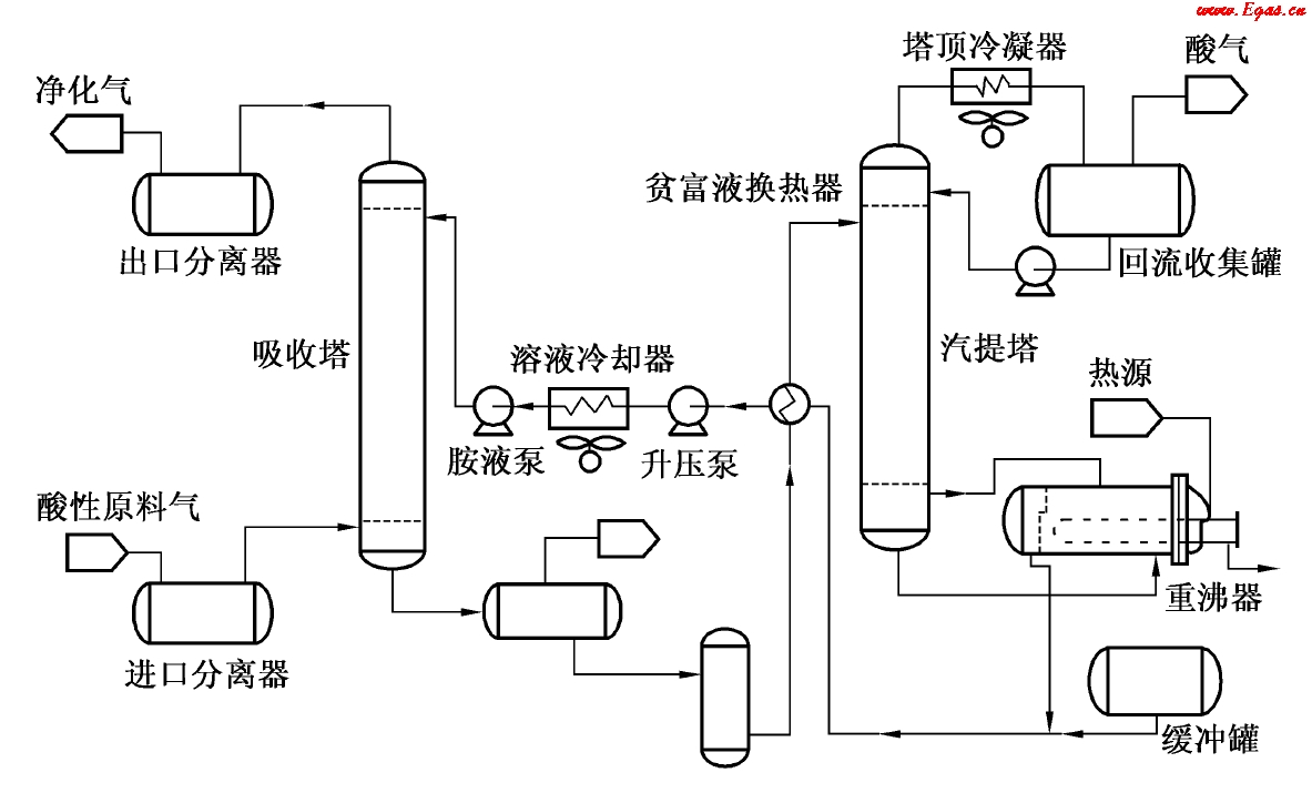 原料氣通過分離器除去游離的液體及夾帶的固體雜質(zhì)后進(jìn)入吸收塔,在塔內(nèi)自下而上地和醇胺溶液逆流接觸而脫除酸氣組分,出吸收塔的凈化氣經(jīng)分離器而排出裝置。吸收塔底排出的富液經(jīng)貧/富液換熱器與貧液傳熱而升溫,然后進(jìn)入汽提塔上部。在高壓下操作的裝置通常富液先經(jīng)過閃蒸罐,盡可能閃蒸出溶解于脫硫溶液中的烴類后再汽提再生,以避免損失原料氣和影響再生質(zhì)量。汽提塔底部排出的貧液經(jīng)換熱器冷卻后,返回吸收塔上部。