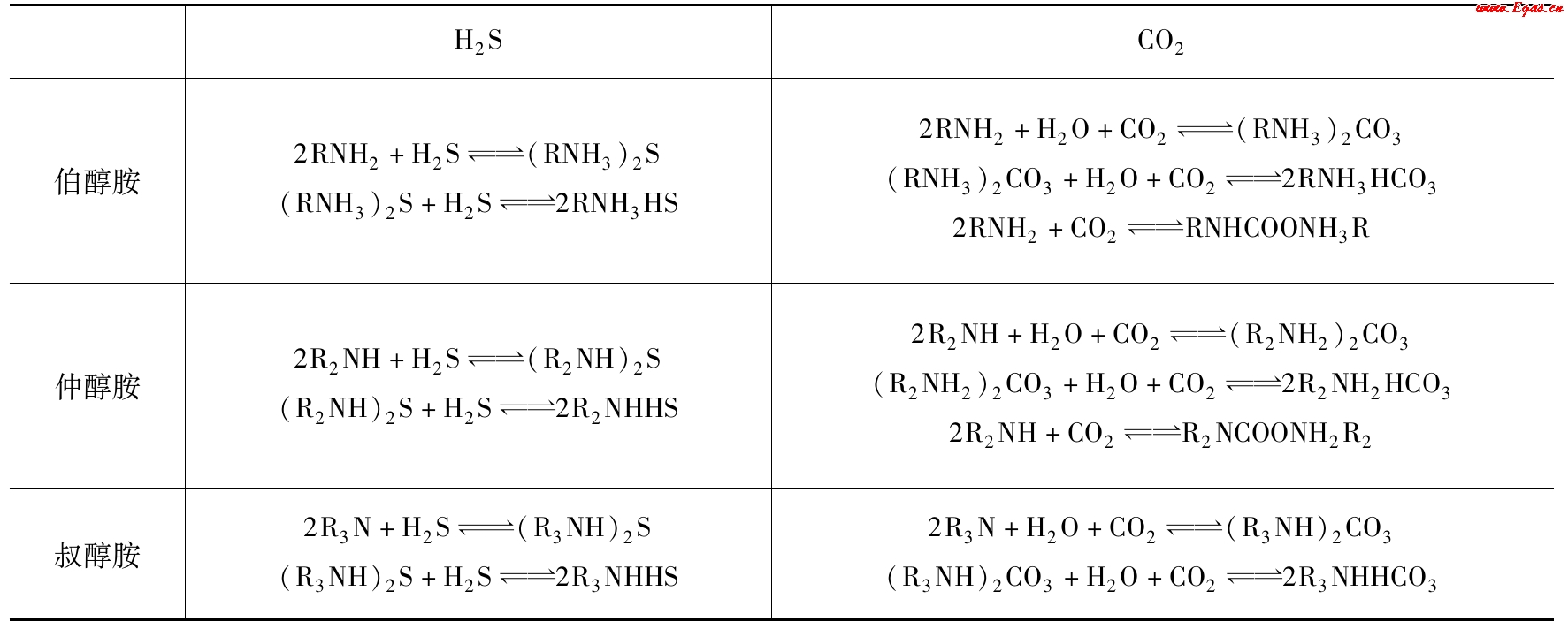 醇胺類化合物中至少含有一個羥基和一個胺基。羥基的作用是降低化合物的蒸氣壓,并增加化合物在水中的溶解度;而胺基則為水溶液提供必要的堿度,促進(jìn)水溶液對酸氣組分的吸收。按連接在氮原子上的“活潑”氯原子數(shù),醇胺可分為伯醇胺(如一乙醇胺—MEA)、仲醇胺(如二乙醇—DEA和二異丙醇胺—DIPA)以及叔醇胺(如甲基二乙醇胺—MDEA)三類。它們與H2S、CO2的主要反應(yīng)如表2-3所示。