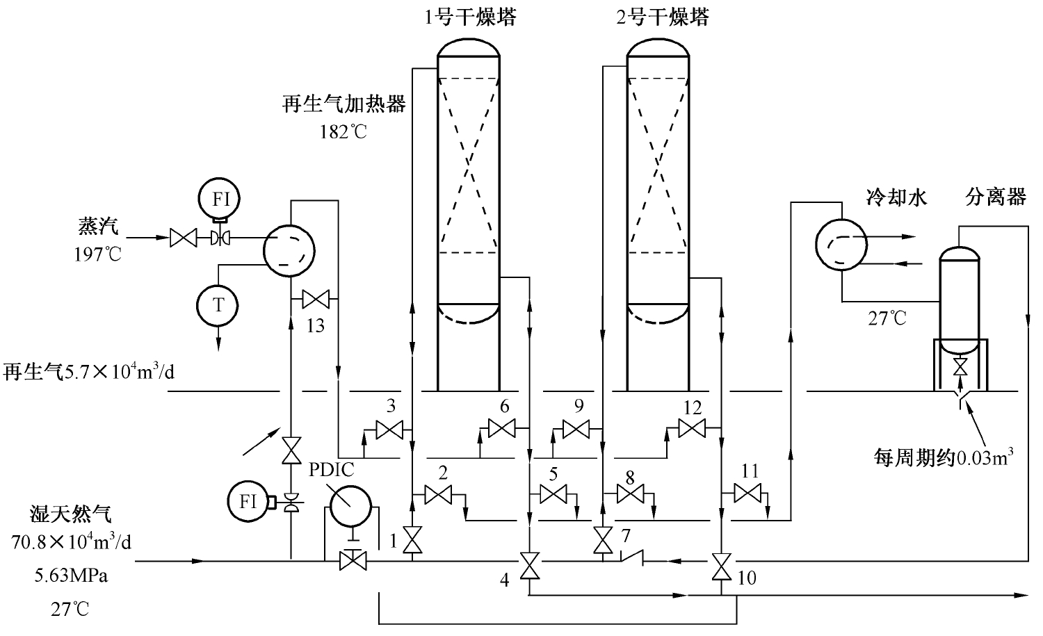 圖2-4為典型的雙塔干燥劑脫水裝置的流程圖。任何固體干燥劑脫水系統(tǒng)的基本組成是: