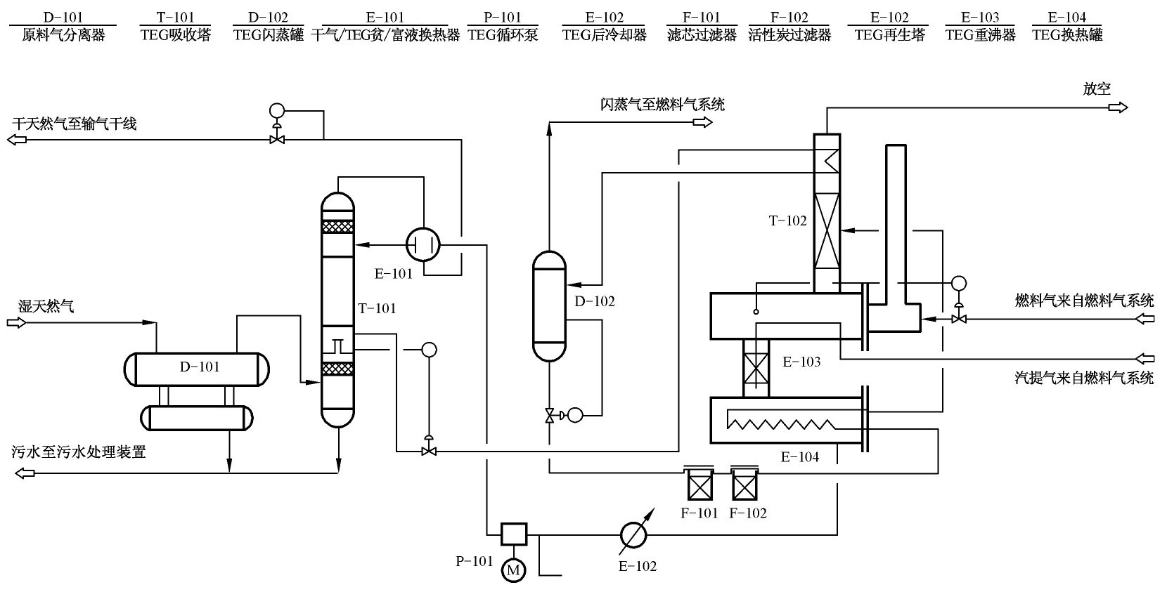 工藝過(guò)程的中心設(shè)備是吸收塔。用泵將TEG泵到吸收塔的頂部,TEG經(jīng)過(guò)吸收塔時(shí)與氣流逆流而向下流動(dòng),富TEG水溶液從塔底排出,再經(jīng)過(guò)冷凝器的盤管升溫并過(guò)濾后進(jìn)入閃蒸罐閃蒸,然后液相流入貧/富甘醇熱交換器,經(jīng)進(jìn)一步升溫并過(guò)濾后進(jìn)入脫水單元的再生器部分,在再生塔內(nèi)通過(guò)加熱使TEG吸收的水分在常壓下脫除;再生后的TEG經(jīng)貧/富甘醇熱交換器冷卻后,然后泵入吸收塔循環(huán)使用。而濕天然氣由吸收塔底進(jìn)入經(jīng)入口洗滌器后自下而上與TEG接觸傳質(zhì)后經(jīng)塔頂分離器后外輸。