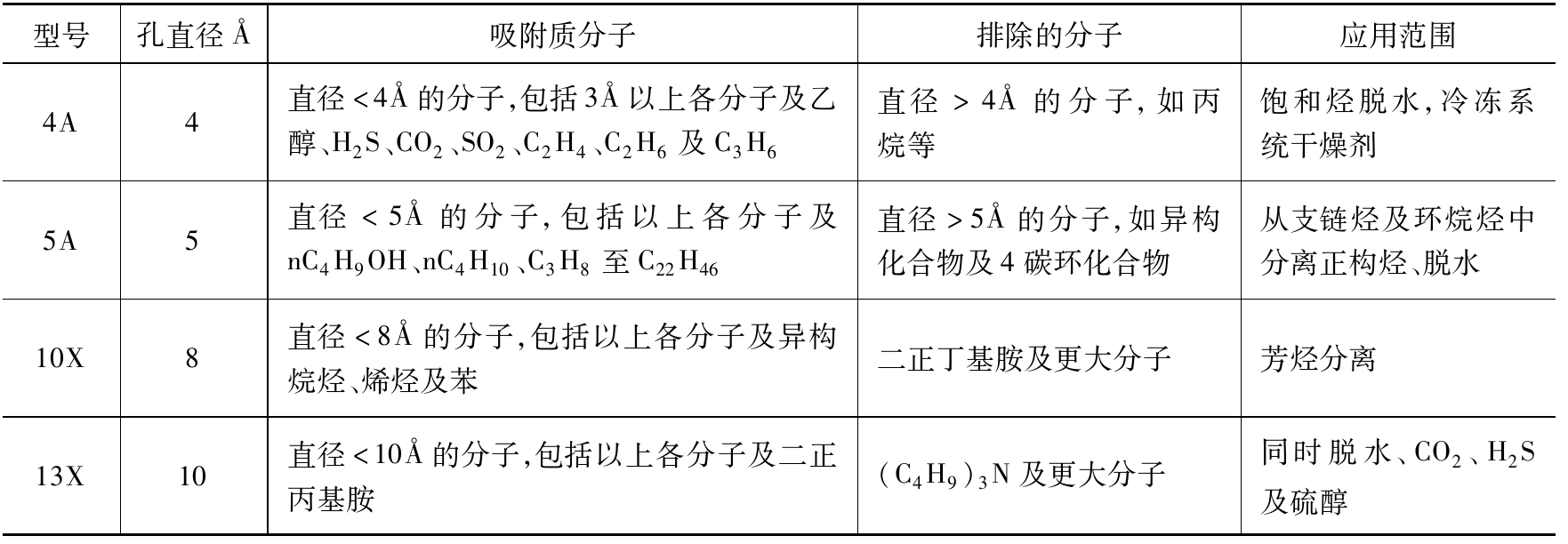 不同型號(hào)的分子篩的特性見(jiàn)表2-5。