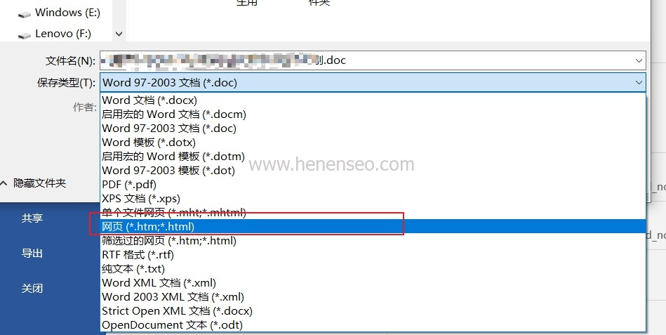 3、在另存為對(duì)話框中選擇文件類型為html網(wǎng)頁(yè)文件。