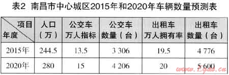 根據(jù)《南昌市出租汽車十年發(fā)展規(guī)劃(2010~2019年)》及推測數(shù)據(jù),2015年,2020年南昌市中心城區(qū)車輛數(shù)量預(yù)測見表2。