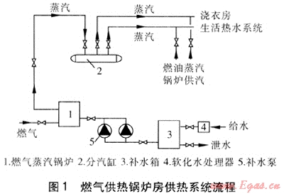 該酒店裙樓地下共有3層,其中地下一層的原發(fā)電機組儲油庫現(xiàn)已停止使用,建筑面積約60m2,緊鄰地下一層出口坡道,距燃氣進戶管道8m,經(jīng)改造后,可作為燃氣供熱鍋爐房。燃氣供熱鍋爐房供熱系統(tǒng)流程見圖1。