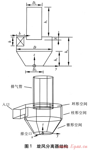 旋風(fēng)分離器的分離效率和分離器內(nèi)的流場是密切相關(guān)的,深入研究分離器內(nèi)的氣固兩相流動特性對于其結(jié)構(gòu)優(yōu)化、提高分離效率有重要意義。近年來,國內(nèi)外在旋風(fēng)分離器結(jié)構(gòu)尺寸、入口流速等對分離效率的影響已經(jīng)做了大量研究和討論,但是對旋風(fēng)分離器入口截面高寬比對分離器分離效率影響的研究還不多。本文對入口截面高寬比對旋風(fēng)分離器內(nèi)流場的影響進行探討。