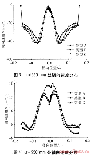 切向速度和軸向速度是影響旋風(fēng)分離器分離效率的重要因素,本文選取z=550、670mm高度上的軸向速度和切向速度,分析柱形空間和環(huán)形空間內(nèi)的切向速度和軸向速度分布。逆時針方向為切向速度的正方向,z軸正方向為軸向速度的正方向。由于本文的旋風(fēng)分離器為順時針切向進氣,因此分離器內(nèi)流體的切向速度為負。入口風(fēng)速為15m/s時,3種類型的旋風(fēng)分離器在z=550mm高度上氣相流體的切向速度分布和軸向速度分布見圖3、4。由圖3、4可知,在柱形空間的外旋渦區(qū),類型A旋風(fēng)分離器壁面切向速度最小,類型B次之,類型C最大。即隨著高寬比的增大,旋風(fēng)分離器壁面附近的流體切向速度增大。類型A旋風(fēng)分離器的切向速度最大值的徑向位置離壁面最遠,類型B次之,類型C最近,即隨著高寬比的增大,切向速度的最大值的徑向位置逐漸向壁面靠攏。在旋風(fēng)分離器內(nèi),固體顆粒主要是在高速旋轉(zhuǎn)產(chǎn)生的離心力作用下從氣體中分離出來的。當分離器的高寬比增大時,壁面附近的切向速度變大,最大切向速度的徑向位置更靠近壁面。由于壁面切向速度變大以及外旋渦向壁面靠近,氣固兩相流中的顆粒所受的離心力變大,更容易擺脫氣相流體的牽引,被壁面捕集而被分離,從而提高分離效率。