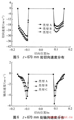 入口風(fēng)速為15m/s時,3種類型的旋風(fēng)分離器在環(huán)形空間內(nèi)z=670mm高度上的切向速度分布和軸向速度分布見圖5、6。由圖5、6可知,類型A旋風(fēng)分離器切向速度最小,向下的軸向速度最大;類型B次之;類型C分離器切向速度最大,向下的軸向速度最小。即隨著高寬比的降低,向下的軸向速度增加。環(huán)形空間內(nèi)氣流向下的軸向速度增加,特別是靠近排氣管壁外側(cè)的氣流向下的軸向速度增加較大,這也會加劇“短路流”現(xiàn)象,導(dǎo)致分離效率的降低。
