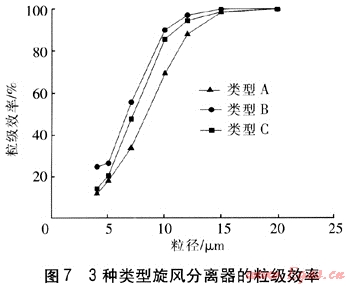 粒級效率是指某一給定粒徑或粒徑范圍的分離效率,切割粒徑是分離效率為50%時的顆粒粒徑。粒級效率圖可以清晰表明旋風(fēng)分離器對不同粒徑顆粒的分離性能。3種類型旋風(fēng)分離器的粒級效率見圖7。由圖7可知,類型B旋風(fēng)分離器的切割粒徑最小。3種類型旋風(fēng)分離器的分離效率分別為:A:88.71%,B:91.54%,C:90.27%。因此,當入口高寬比增大或減小時,分離器的切割粒徑都變大,從而使分離器的分離效果變差。在實際工程運用中,應(yīng)當保持旋風(fēng)分離器入口高寬比在一個合適范圍內(nèi),使得旋風(fēng)分離器具有最佳的分離效率。