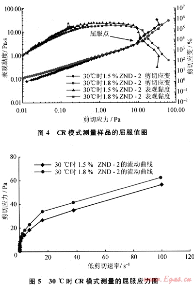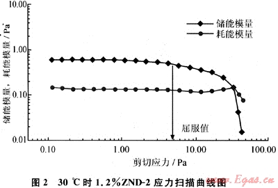 使用RS6000型流變儀,采用錐板C60/1轉(zhuǎn)子系統(tǒng),固定頻率1Hz,應(yīng)力幅度掃描0~60Pa,樣品在加熱到待測溫度時恒溫10min(以下同)。1.2%ZND-2的應(yīng)力掃描曲線(見圖2)的儲能模量大于耗能模量,表明凝膠彈性高于黏性,屬于黏彈性流體。儲能模量(G′)平行于橫坐標,直到τ0=4.55Pa時才開始明顯偏離G′=0.54Pa的恒定值。線性黏彈區(qū)限定為G′=0.54Pa以內(nèi),此種方法認為線性黏彈區(qū)和非線性黏彈區(qū)的界限為樣品的屈服值。