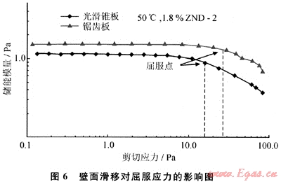考慮了壁面光滑程度對屈服值的影響,采用了鋸齒狀平板轉(zhuǎn)子測量凝膠的屈服值(見圖6),光滑錐板和鋸齒狀板線性黏彈區(qū)與非線性黏彈區(qū)交點對應(yīng)的1.8%凝膠ZND2的屈服值為16.77Pa和24.56Pa,屈服值差為46.5%。而鋸齒狀平板轉(zhuǎn)子選用CS模式和CR模式在低應(yīng)力和低剪切速率范圍內(nèi)得到的數(shù)值波動到劇烈,數(shù)值不穩(wěn)定[10]。