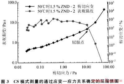 1) 選用CS控制應(yīng)力模式測量特種凝膠的屈服值符合屈服值定義,通過應(yīng)變一應(yīng)力雙對數(shù)曲線拐點能夠準確的判斷凝膠樣品的屈服值。