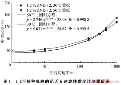 范氏旋轉(zhuǎn)黏度計測試的1.2%ZND-2的流變數(shù)據(jù)如圖1所示,采用帶屈服值的假塑性流變模式回歸得到的相關(guān)系數(shù)高,回歸計算得到的30℃、50℃的屈服值分別為28.08Pa、28.67Pa;而采用鉆井液靜屈服值測量方法得到的10min屈服值分別為33.5Pa和41Pa,高于回歸方法得到的屈服值。受量程限制,此法不能測更高濃度的凝膠ZND2。