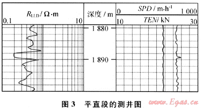 圖3為資料中感應(yīng)電阻率曲線(RILD)及同次測井帶測的張力曲線(TEN)、速度曲線(SPD)。軟件利用曲線擬合法檢查出1888.11~1889.21m為平直段(幅度值均為0.2Ω·m,該段相對均方差為0),同時(shí)張力曲線和速度曲線在相應(yīng)的深度段沒有明顯異常,說明并不是因?yàn)閮x器遇卡現(xiàn)象引起的平直段.因此軟件判斷1888.11~1889.21m為平直異常。