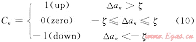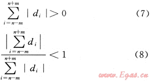 式(7)說明在第n個(gè)點(diǎn)附近存在較大變化,在滿足式(7)的同時(shí)滿足式(8)說明在該點(diǎn)附近也存在較大的反向變化,可判斷為“跳動”。
