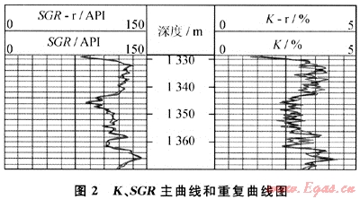 圖2為資料中深度校正后的總自然伽馬(SGR)、鉀含量(K)曲線的主曲線和重復(fù)曲線圖,石油天然氣行業(yè)標(biāo)準(zhǔn)SY/T 5132—2003《測井原始資料質(zhì)量要求》中對自然伽馬能譜測井重復(fù)性的要求為:重復(fù)曲線與主曲線形狀基本相同,總自然伽馬重復(fù)測量值相對誤差應(yīng)小于5%,鉀的重復(fù)測量值相對誤差應(yīng)小于10%。結(jié)合企業(yè)生產(chǎn)實(shí)際,約定重復(fù)誤差符合標(biāo)準(zhǔn)的井段總長度不得少于45m(常規(guī)測井重復(fù)曲線至少測50m,50m時(shí)90%要符合標(biāo)準(zhǔn),即50×90%=45m)。軟件經(jīng)計(jì)算得:曲線SGR重復(fù)曲線與主曲線相關(guān)系數(shù)為0.983,曲線校深后,重復(fù)誤差符合標(biāo)準(zhǔn)的井段總長度為53.5m;曲線K重復(fù)曲線與主曲線相關(guān)系數(shù)為0.765,校深后,重復(fù)誤差符合標(biāo)準(zhǔn)的井段總長度為36.5m。因此,軟件得到重復(fù)性檢查結(jié)論:曲線SGR合格,曲線K不合格。