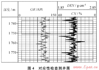 圖4是資料中伽馬曲線(GR)、密度曲線(DEN)、中子曲線(CN)。以GR曲線為基準(zhǔn)曲線劃分層段并挑選層段,1736.81~1750.61m和1768.01~1777.51m(圖中紅框標(biāo)示)是軟件挑選的兩個(gè)層段,在兩個(gè)層段DEN曲線和CN曲線的相關(guān)系數(shù)分別為-0.75和-0.74,與預(yù)先設(shè)置的規(guī)則(負(fù)相關(guān)、最小相關(guān)系數(shù)0.7,依據(jù)地區(qū)經(jīng)驗(yàn)設(shè)置)相比,軟件判斷DEN曲線和CN曲線的對應(yīng)性合格。