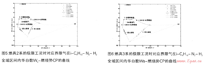 根據(jù)試驗(yàn)測(cè)定的燃具1系在脫火、回火及CO超標(biāo)時(shí)所對(duì)應(yīng)的原料氣組分,計(jì)算各界限工況點(diǎn)對(duì)應(yīng)的燃燒特性參數(shù),包括燃?xì)飧邿嶂礖2、相對(duì)密度d、華白數(shù)Ws、燃燒勢(shì)CP等,建立直角坐標(biāo)系。繪制華白數(shù)Ws-燃燒勢(shì)CP曲線(xiàn),見(jiàn)圖3;華白數(shù)Ws-燃燒勢(shì)CP在i-C4H10-N2-H2區(qū)間內(nèi)的曲線(xiàn),見(jiàn)圖4。