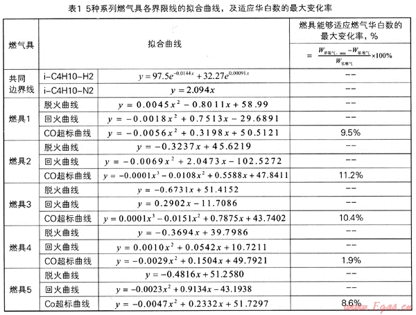 根據(jù)實(shí)驗(yàn)測(cè)得的各系列燃具在界限工況時(shí)對(duì)應(yīng)界限試驗(yàn)氣的組分?jǐn)?shù)據(jù),計(jì)算得到對(duì)應(yīng)燃?xì)獾娜紵匦詤?shù),及圖3~8所示的各特性曲線(xiàn),進(jìn)行回歸分析與曲線(xiàn)擬合,其擬合曲線(xiàn)見(jiàn)表6。
