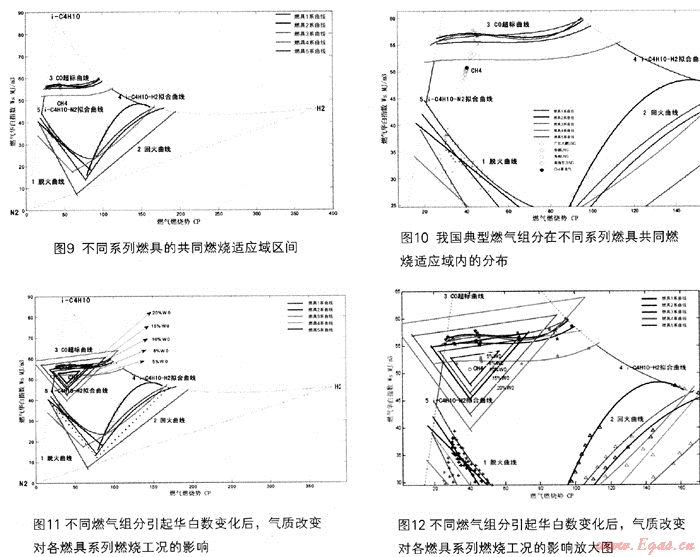如前述圖3~8所示,以燃?xì)馊A白數(shù)顫、燃?xì)馊紵齽?shì)CP兩個(gè)參數(shù),建立的坐標(biāo)圖形,可以得到比較平滑的脫火、回火及CO超標(biāo)等極限燃燒特性曲線(xiàn),并可形成比較穩(wěn)定的燃?xì)饩哌m應(yīng)性封閉區(qū)域。