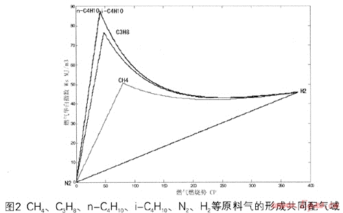 由圖2可以看出:以CH4、H2、N2三組分,C3H8、H2、N2三組分,n-C4H10、H2、N2三組分,i-C4H10、H2、N2三組分等形成的各配氣區(qū)間和共同配氣域,其邊界線(xiàn)并不都是直線(xiàn)形式。各原料氣形成的配氣邊界線(xiàn)中,任兩組可燃?xì)怏w形成的配氣邊界線(xiàn)為指數(shù)曲線(xiàn)形式;而N2與H2、N2與另一可燃?xì)怏w形成的配氣邊界線(xiàn)為直線(xiàn)形式。