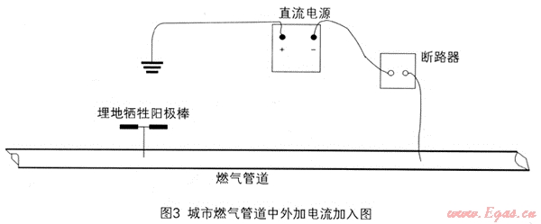 城市燃?xì)夤艿琅c長輸燃?xì)夤艿老啾?,布局?fù)雜,支管多,管道周圍干擾因素多,燃?xì)庑孤┰斐傻奈:Υ螅仨殞Τ鞘腥細(xì)夤芫W(wǎng)進(jìn)行定期的防腐層檢測,確保安全[4]。目前我國的城市燃?xì)夤芫W(wǎng)陰極保護(hù)主要采取犧牲陽極方法,而DCVG檢測技術(shù)需要外加電源,所以應(yīng)用時(shí)須在燃?xì)夤艿乐屑又绷麟娏鳌V绷麟娫吹耐饧尤鐖D3所示:可調(diào)節(jié)的直流電源正極接地,負(fù)極通過閥門測試樁或閥門井與燃?xì)夤艿辣谶B接,負(fù)極與燃?xì)夤艿乐g接電路通斷器來實(shí)現(xiàn)管路電流的周期性通斷。