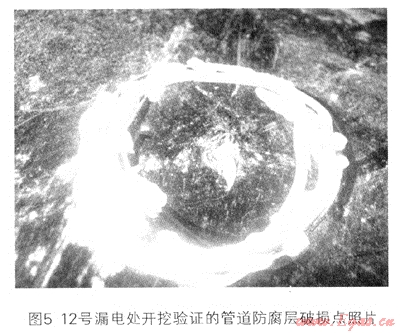 第二外加電流處,極化后,通電電位Von=-1560mV,斷電電位Voff=-1010mV,管道到遠(yuǎn)大地點(diǎn)的電位差為VT=550mV,犧牲陽極上形成的電位差VTC為60mV,9~12處漏電點(diǎn)由2號(hào)測試樁提供的信號(hào)檢出,由表中數(shù)據(jù)可以看出,9號(hào)點(diǎn)檢測到的犧牲陽極旁的土壤距遠(yuǎn)方大地的電位差Vs與犧牲陽極上形成的電位差VTC基本相當(dāng),初步判斷為犧牲陽極,隨后的開挖驗(yàn)證證實(shí)了此判斷。9、10、12號(hào)漏電點(diǎn)的IRC已經(jīng)大于100%,所以判斷這些點(diǎn)連接有犧牲陽極,但不排出伴隨有防腐層破壞。其中12號(hào)漏電點(diǎn)的IRC已經(jīng)高達(dá)163%,伴隨有管道防腐層破壞的可能性很大。恰好此處具備開挖條件。開挖后發(fā)線該處有犧牲陽極,同時(shí)伴隨有管道防腐層破壞,如圖5所示。另外,此12處漏電點(diǎn)相隔距離基本上是相隔200~400m,這也符合一般犧牲陽極埋設(shè)距離,能夠?yàn)殛枠O信號(hào)干擾排除提供依據(jù)。