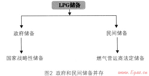 目前世界上的LPG儲備主要有兩種儲備模式:如美國,有多家資本雄厚的大型燃氣能源經(jīng)營企業(yè),這些企業(yè)自發(fā)建立大量儲備;如日本、韓國,由政府和民間共同承擔LPG儲備。國家建立公共儲備的同時,強制企業(yè)建立一定的商業(yè)儲備。如圖2所示