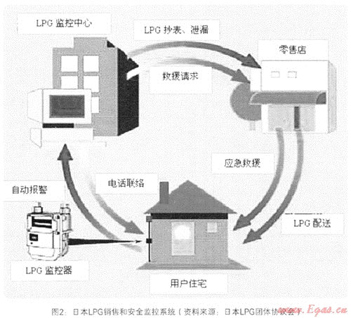 在日本LPG的銷售方式主要有三種,對于一般家庭用戶主要采取瓶裝LPG供應方式,瓶容量一般有20Kg、30Kg、50Kg(鋼瓶的使用壽命為25年);使用管道供應用戶,根據法律規(guī)定按照供應用戶多少又分為小規(guī)模管道供應系統(tǒng)和簡易LPG供應系統(tǒng);使用LPG撬車供應。對一般用戶而言主要以瓶裝LPG方式供應主為主,經營者依靠遠傳用戶信息管理系統(tǒng),可以在用戶沒有意識到瓶裝LPG即將用完的情況下,主動上門為用戶更換確保在供應不中斷,LPG使用量以設置于用戶處的LPG計量器具所顯示數值為準。