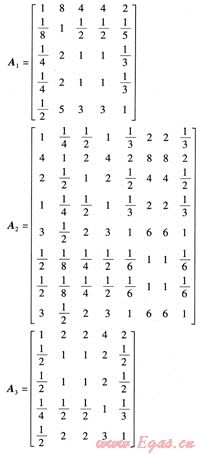 通過(guò)mat lab計(jì)算得到各成對(duì)比較矩陣的最大特征值分別為: