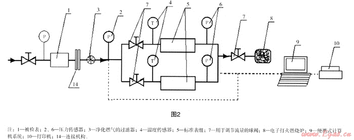 A. 總體思路:裝置采用標(biāo)準(zhǔn)表法對在線燃?xì)獗磉M(jìn)行檢定,其工作原理是:在線實(shí)流燃?xì)饨?jīng)過被檢表,根據(jù)實(shí)際流量大小流經(jīng)在線燃?xì)饬髁繕?biāo)準(zhǔn)裝置中的標(biāo)準(zhǔn)表,分別由標(biāo)準(zhǔn)表表前、表后的壓力傳感器測得被檢表表后及標(biāo)準(zhǔn)表前后的燃?xì)鈮毫?,由溫度傳感器測得管路中的燃?xì)鉁囟?,并將所測數(shù)據(jù)傳輸至計(jì)算機(jī),被檢表前壓力及被檢表數(shù)據(jù)也輸入至計(jì)算機(jī),數(shù)據(jù)處理后,自動(dòng)判斷被檢表是否合格。經(jīng)過標(biāo)準(zhǔn)表后的燃?xì)膺M(jìn)入燃燒爐后被燃燒處理,可避免污染大氣。為了能使該裝置適用于較大的測量范圍,標(biāo)準(zhǔn)裝置中可以并聯(lián)設(shè)置多塊不同量程的標(biāo)準(zhǔn)表,根據(jù)實(shí)流燃?xì)獾膶?shí)際流量大小,選擇流經(jīng)相應(yīng)的標(biāo)準(zhǔn)表。在每一臺(tái)標(biāo)準(zhǔn)表前的管路上均設(shè)有流量調(diào)節(jié)閥??筛鶕?jù)流量大小選用任意一臺(tái)標(biāo)準(zhǔn)表,或同時(shí)開通并聯(lián)的兩臺(tái)或幾臺(tái)標(biāo)準(zhǔn)表,便于擴(kuò)大燃?xì)饬髁繖z測范圍。