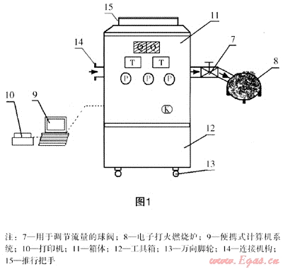 B. 箱體外觀:為在線實(shí)流檢測的方便性,將裝置設(shè)計(jì)為可移動(dòng)式箱體,箱體下部設(shè)有工具箱,以提高其便攜性。為了方便其移動(dòng),裝置箱體頂部設(shè)計(jì)有推行把手,箱體底部設(shè)有萬向腳輪,箱體內(nèi)設(shè)有與檢定管路相連接的一臺(tái)或相并聯(lián)的一臺(tái)以上的標(biāo)準(zhǔn)表,標(biāo)準(zhǔn)表選用高準(zhǔn)確度氣體腰輪流量計(jì),檢定管路的進(jìn)氣端設(shè)有可與被檢表連接的連接機(jī)構(gòu),標(biāo)準(zhǔn)表前后及被檢表后均設(shè)有一段直管段,在每一臺(tái)標(biāo)準(zhǔn)表前的管路上均設(shè)有流量調(diào)節(jié)閥,為了提高測量準(zhǔn)確度,在標(biāo)準(zhǔn)表前設(shè)有凈化燃?xì)獾倪^濾器。在每一臺(tái)標(biāo)準(zhǔn)表前后的管路上設(shè)置有與便攜式計(jì)算機(jī)系統(tǒng)連接的壓力傳感器和溫度傳感器,在檢定管路的末端設(shè)有與其連接的燃燒爐,以保證防止大氣污染。