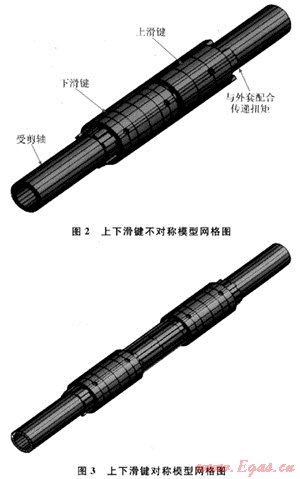 分析結(jié)構(gòu)為隨鉆安全接頭的中軸受剪模型,分兩種幾何模型分別分析,以討論模型受剪的最優(yōu)方式:①上下滑鍵非對稱模型,扭矩通過外套傳給上滑鍵端部;②上下滑鍵對稱模型,扭矩通過8個(gè)銷孔施加,分別見如圖2、3。