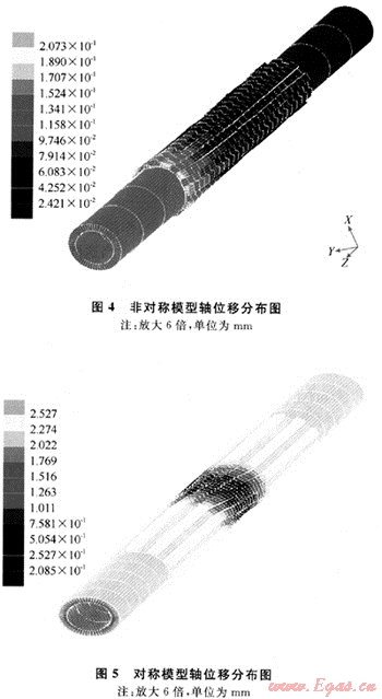 圖4和圖5給出了兩種模型軸向位移分布圖,從圖中可以看出:對稱結(jié)構(gòu)的中軸受剪效果明顯優(yōu)于非對稱結(jié)構(gòu),各部分位移分布也更合理,在隨鉆安全接頭的設(shè)計(jì)中宜用對稱結(jié)構(gòu)。