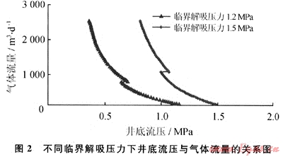 2顯示了在煤層供氣充足的條件下井筒中井底流壓與氣體流量的關(guān)系,可見(jiàn)井底流壓與氣體流量呈負(fù)相關(guān)關(guān)系,氣體流量隨井底流壓降低而增加。在解吸產(chǎn)氣初期,井底流壓下降快,但氣產(chǎn)量增長(zhǎng)緩慢,表明產(chǎn)氣初期煤層壓降漏斗范圍小,供氣有限;隨著井底流壓不斷下降,地層壓降漏斗逐漸擴(kuò)大,井底流壓下降較小的值就能產(chǎn)出大量的煤層氣。煤層氣臨界解吸壓力越高,井底壓力下降相同的數(shù)值產(chǎn)出的氣體越多。這反映了煤層氣井的地下滲流壓力變化特征。