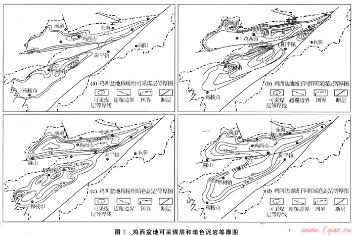盆地在太古代花崗巖和片麻巖基底之上沉積了早白堊世雞西群和樺山群地層。雞西群自下而上為滴道組、城子河組、穆棱組和東山組。滴道組為火山巖夾陸相河湖相沉積,厚50~300m,在盆緣局部分布。城子河組為斷陷期沉積,不整合于滴道組或基底之上,為一套以陸相河流、三角洲和淺湖相為主的砂泥巖沉積,受早白堊世海侵影響,城子河組下部沉積了多層海相泥巖夾層。城子河組總厚600~800m,含煤40余層,可采煤層7~20層,可采煤層累計(jì)厚度為7.88~17.2m;暗色泥巖占城子河組地層總厚的18%~38%。穆棱組為盆地坳陷期沉積,整合于城子河組之上,主要以濱淺湖到半深湖暗色泥巖夾煤層沉積為主,上部有多層凝灰?guī)r夾層。穆棱組地層總厚為700~1100m,含煤20余層,可采煤層1~7層,可采煤層累計(jì)總厚為1.94~6.02m,泥巖占穆棱組地層總厚的29%~42%。穆棱組之上是東山組火山巖和樺山群猴石溝組紫紅色氧化環(huán)境河流相粗砂巖。城子河組和穆棱組是油氣勘探的重點(diǎn)。