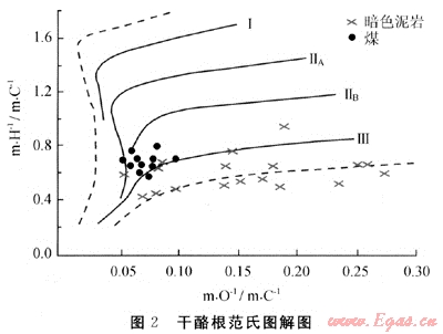 干酪根元素是劃分有機(jī)質(zhì)類型的重要指標(biāo),對(duì)雞西泥巖和煤巖進(jìn)行元素分析,原子比值統(tǒng)計(jì)暗色泥巖H/C為0.30~0.9,O/C為0.04~0.34;煤H/C為0.52~0.79,O/C為0.05~0.09;在范氏圖解中反映主要為腐殖型干酪根,部分為含腐泥的腐殖型,也反映主要以生氣為主[4](圖2)。