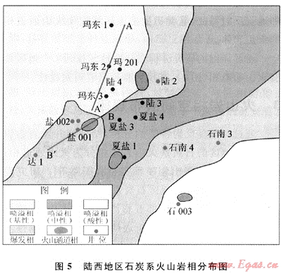 本區(qū)石炭系火山巖巖相分布基本確定,大致呈北東-南西向的條帶狀分布,西北部地區(qū)絕大部分是噴溢相的基性火山巖,向東南依次過渡為爆發(fā)相火山巖、噴溢相的中性火山巖;向北西方向再次出現(xiàn)了爆發(fā)相火山巖,該地區(qū)東南角是噴溢相的中酸性火山巖。從地震剖面上識別出本區(qū)有4個比較明顯的古火山口。在石炭紀時期,本區(qū)經(jīng)歷了大范圍的火山爆發(fā),噴發(fā)出的大量巖漿沿地勢向四周擴散,巖漿由西北角的基性逐漸向南東過渡為中酸性。儲集條件也是由西北向東南逐漸變好,所以位于陸西地區(qū)東南部的石西凸起應作為下一步勘探的重點區(qū)域。