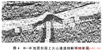 陸西地區(qū)某地震剖面(圖4)呈北東-南西向分布,地震剖面位置見圖5中B-B′。在該剖面中部可見一個內(nèi)部為雜亂和空白反射結(jié)構(gòu)的柱狀-蘑菇狀反射體,該反射體頂部具有明顯的不規(guī)則的蘑菇狀外形,下部為一個斷續(xù)-雜亂的柱狀反射體。其內(nèi)部反射特征為強振幅、低頻率的雜亂反射,內(nèi)部結(jié)構(gòu)常成丘狀的短反射,同相軸多產(chǎn)生扭曲,難以追蹤,視頻率較低,波軸變寬。在蘑菇狀反射體的兩端可見平行結(jié)構(gòu),頂端具有明顯的上超構(gòu)造,兩端具有披覆構(gòu)造。根據(jù)地質(zhì)和地震反射特征,筆者初步把該區(qū)域定為火山通道相的火山巖體。